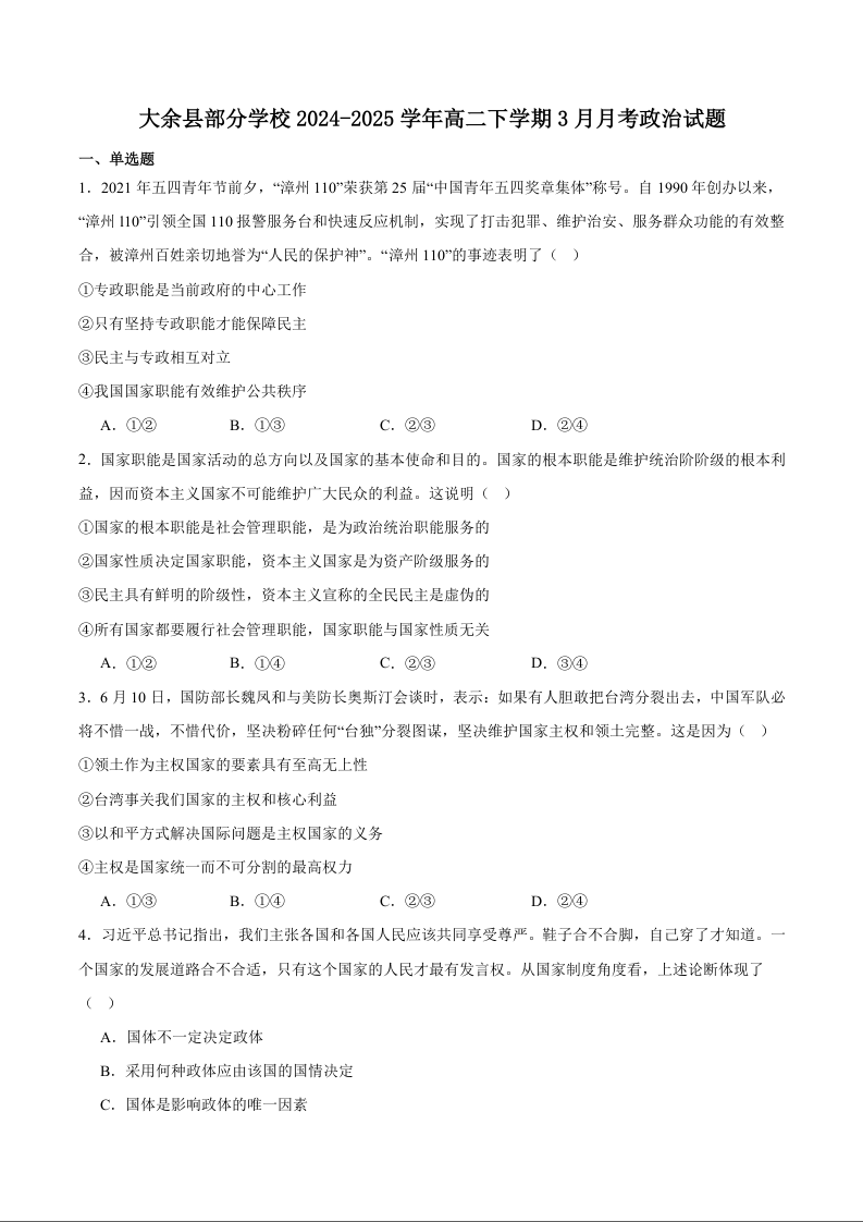 江西省赣州市大余县部分学校2024-2025学年下学期3月高二月考政治+答案