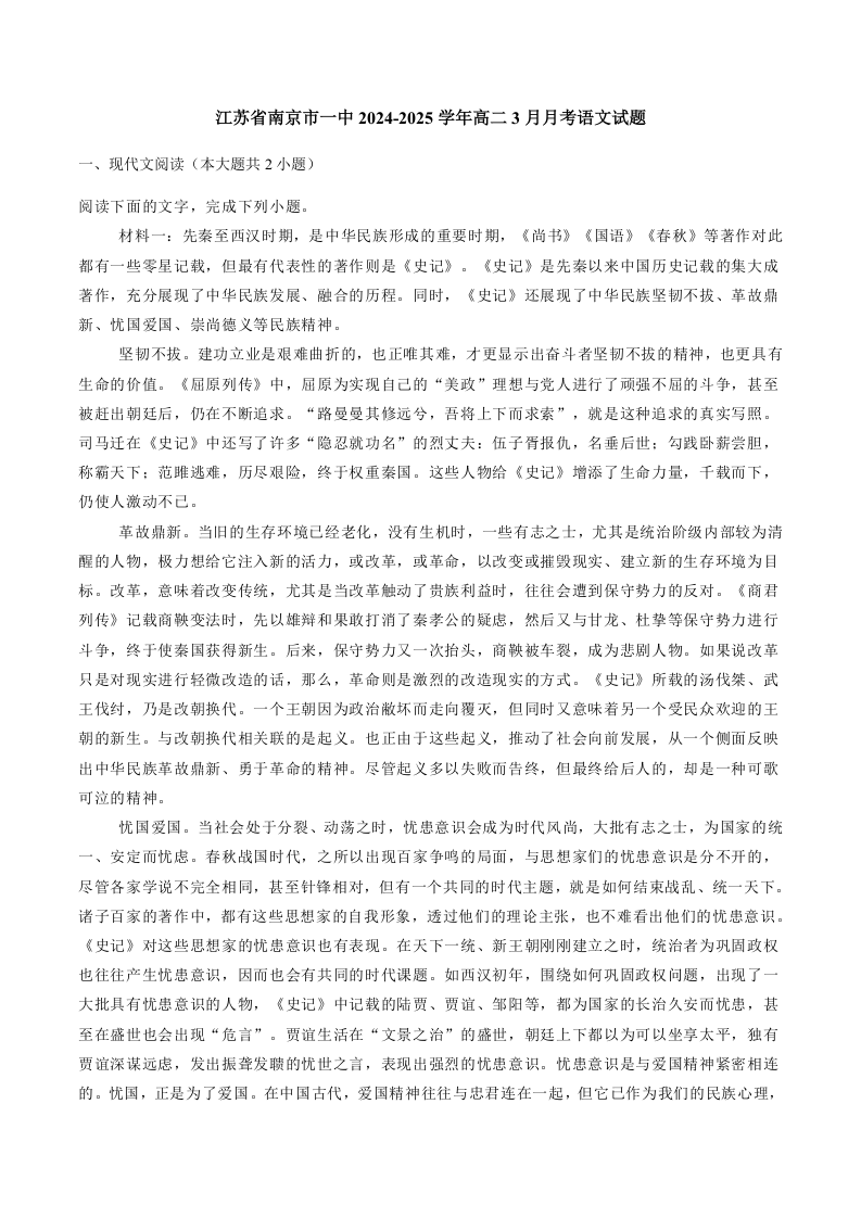 江苏省南京市第一中学2024-2025学年下学期3月高二月考语文+答案