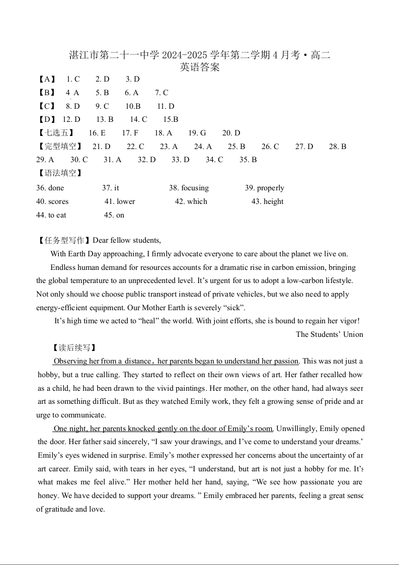 广东省湛江市第二十一中学2024-2025学年高二下学期4月月考英语答案
