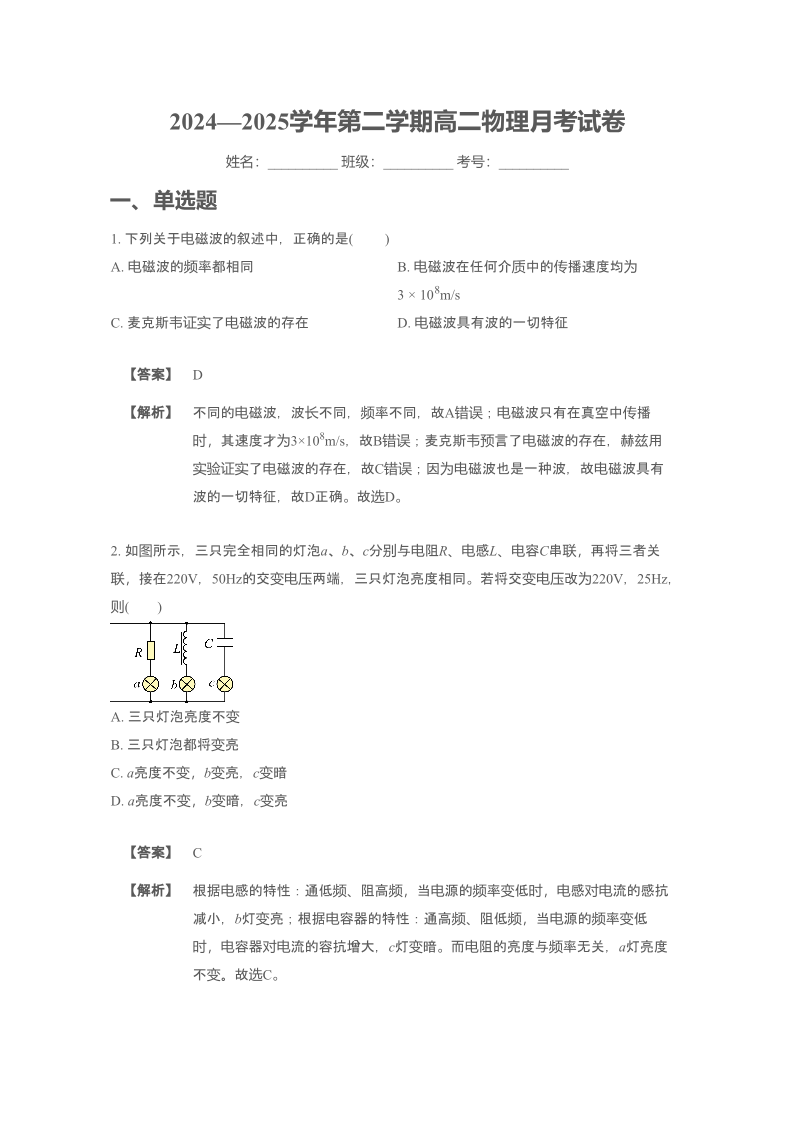 广东省湛江市第二十一中学2024-2025学年下学期4月高二月考物理答案