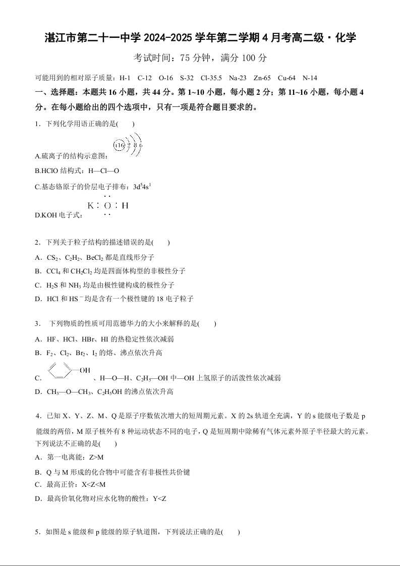 广东省湛江市第二十一中学2024-2025学年高二下学期4月月考化学
