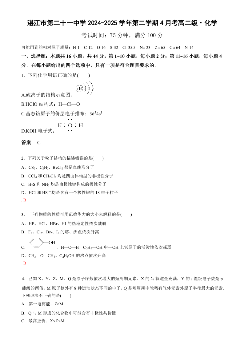 广东省湛江市第二十一中学2024-2025学年高二下学期4月月考化学答案
