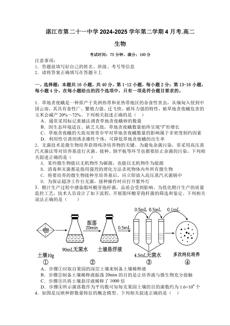 广东省湛江市第二十一中学2024-2025学年高二下学期4月月考生物