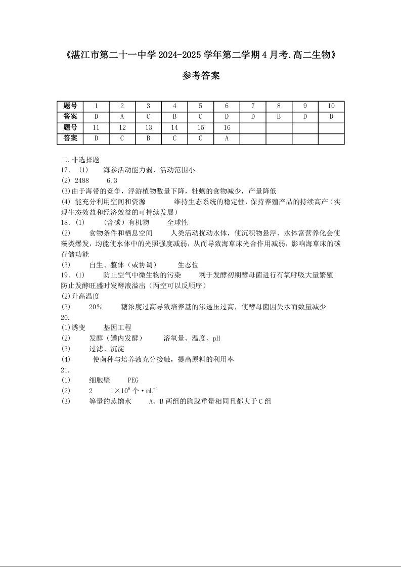 广东省湛江市第二十一中学2024-2025学年高二下学期4月月考生物答案