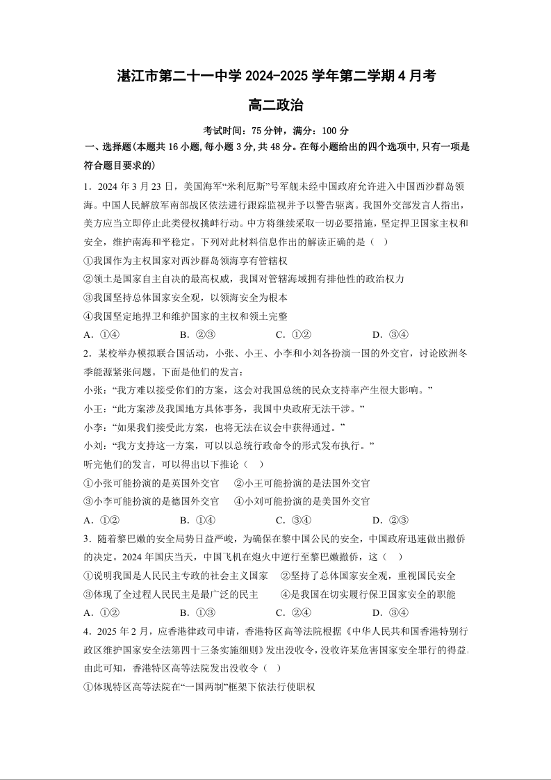 广东省湛江市第二十一中学2024-2025学年高二下学期4月月考政治