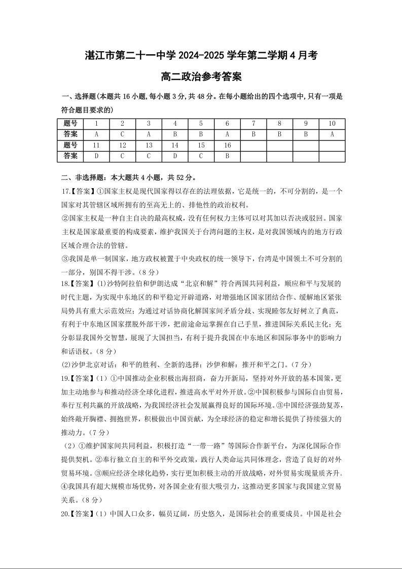广东省湛江市第二十一中学2024-2025学年高二下学期4月月考政治答案
