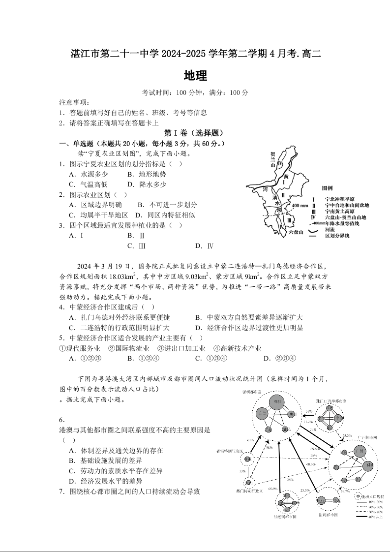 广东省湛江市第二十一中学2024-2025学年高二下学期4月月考地理