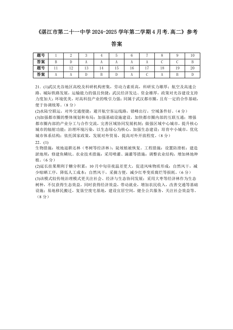 广东省湛江市第二十一中学2024-2025学年高二下学期4月月考地理答案