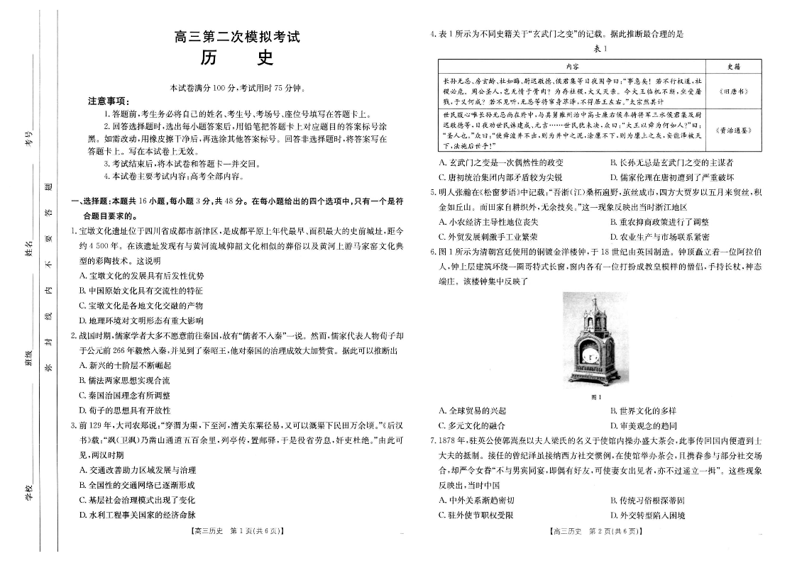 河南省新乡金太阳2025届高三第二次模拟历史+答案