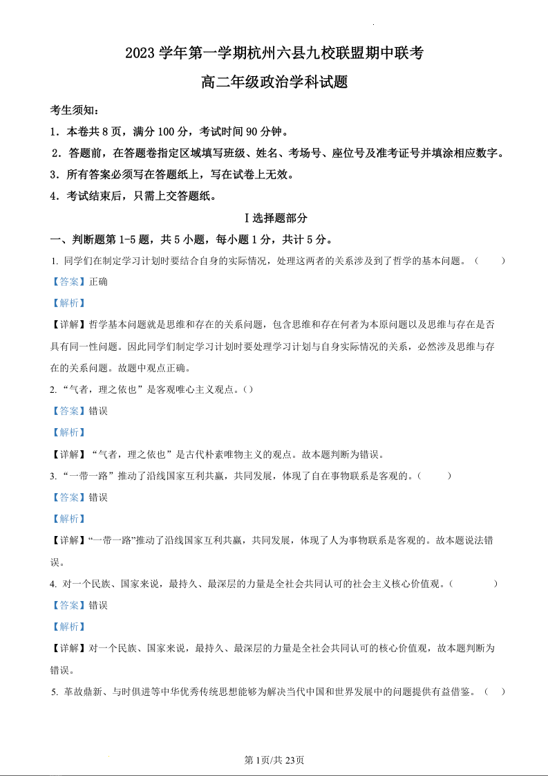 浙江省杭州市六县九校2023-2024学年高二上学期11月期中试题政治(精品解析版)