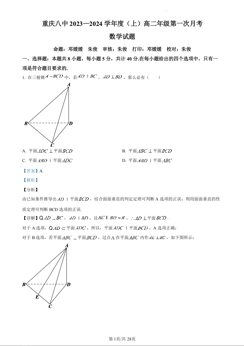 重庆市第八中学校2023-2024学年高二上学期第一次月考试题数学(精品解析版)