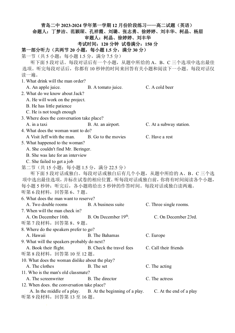 山东省青岛市第二中学2023-2024学年高二上学期12月月考英语