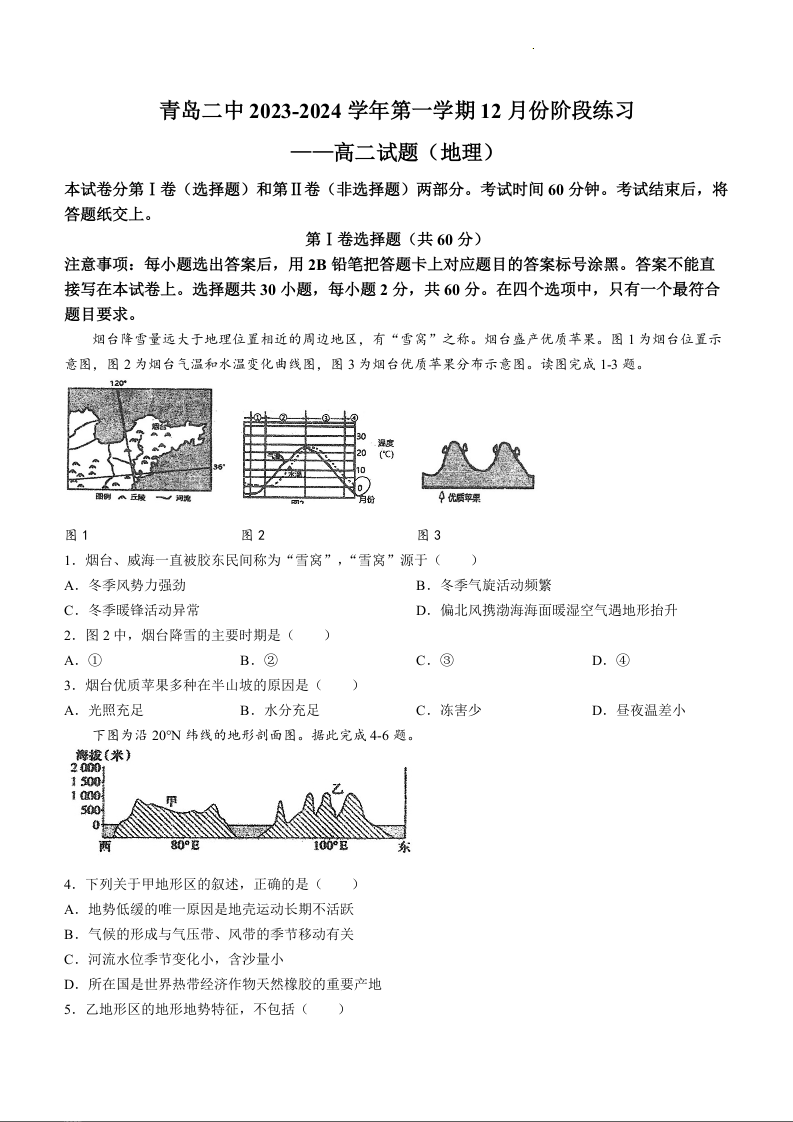 山东省青岛市第二中学2023-2024学年高二上学期12月月考地理