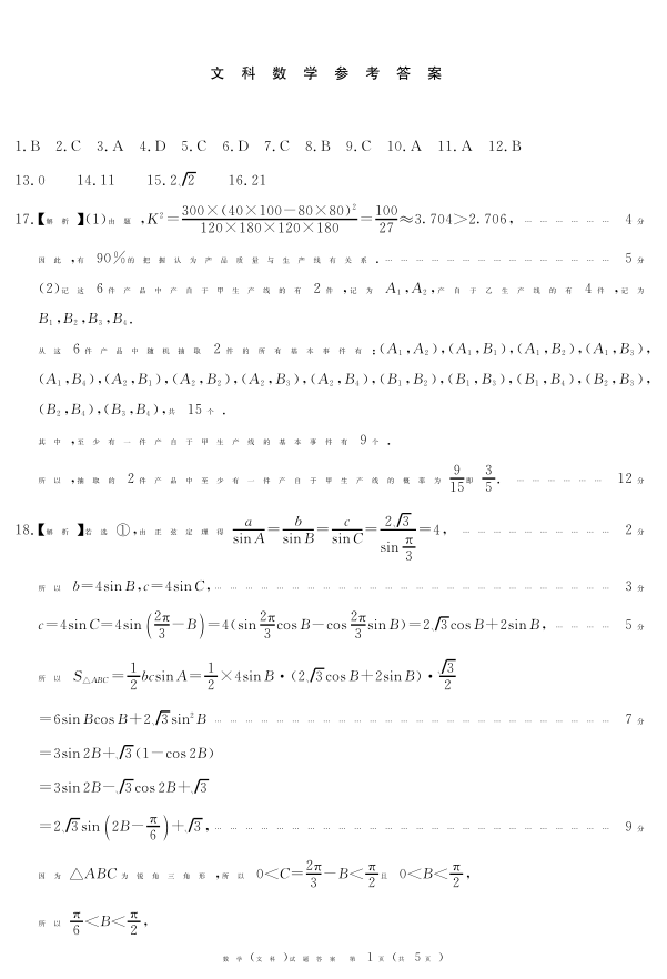 四川省九市高2021级第一次诊断性考试文科数学答案