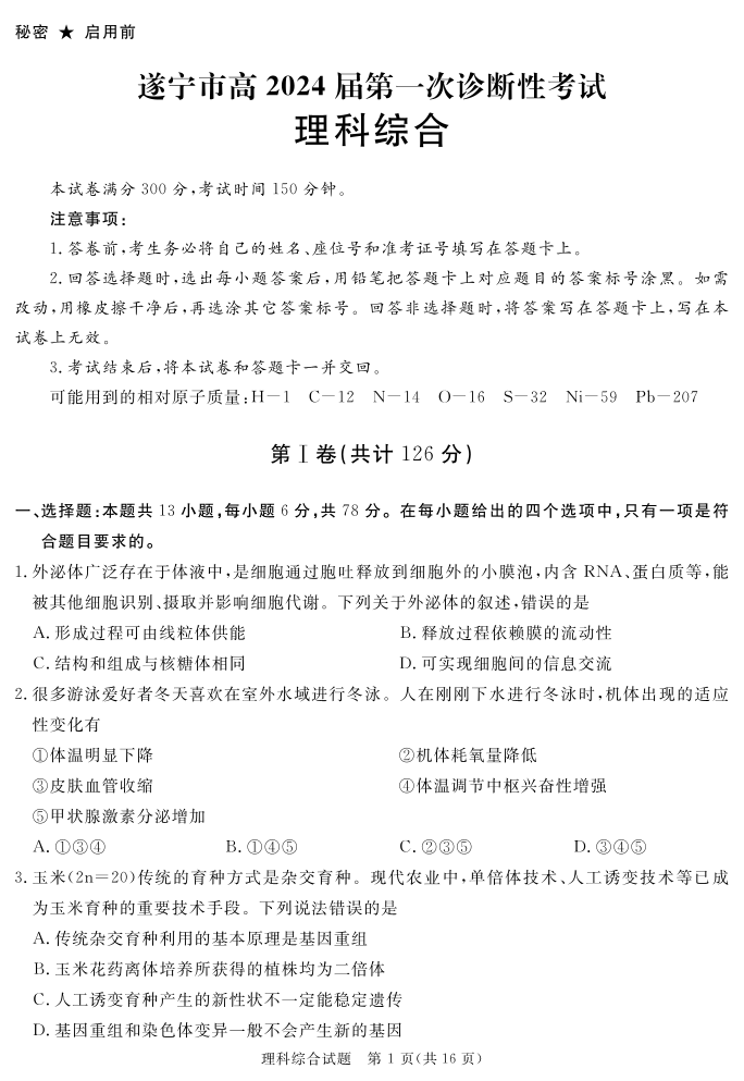 四川省九市高2021级第一次诊断性考试理综