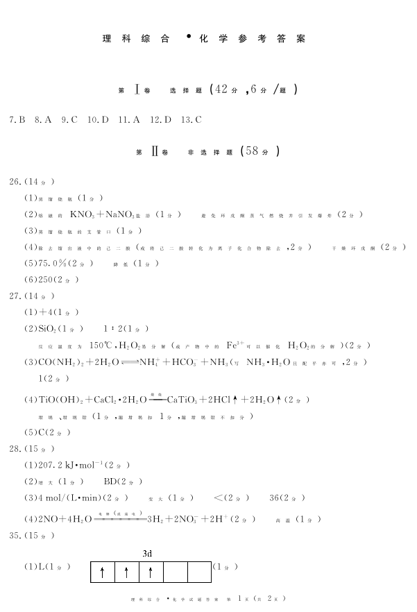 四川省九市高2021级第一次诊断性考试化学答案