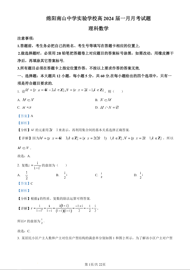 四川省绵阳南山中学实验学校2024届高三上学期1月月考理科数学(精品解析版)