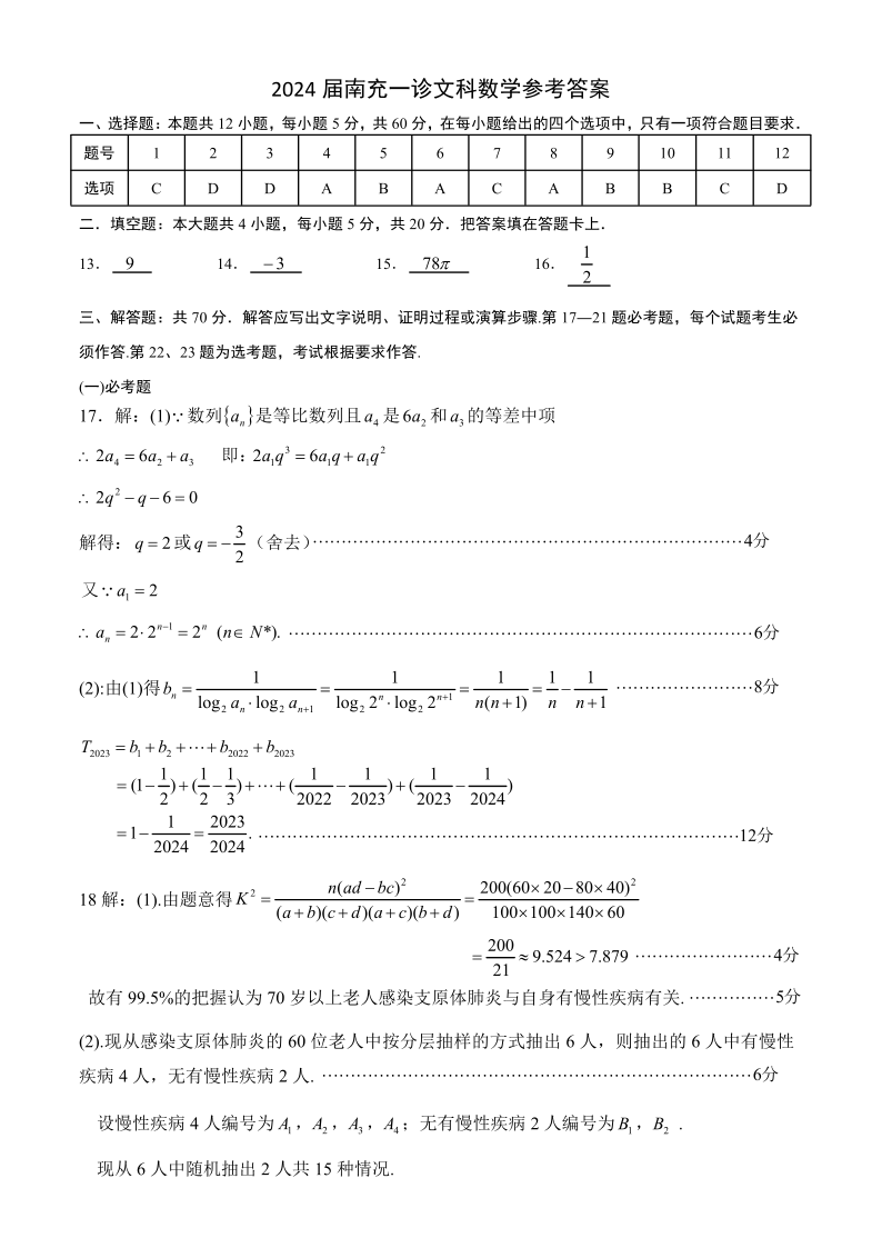 四川省南充市2024届高三上学期一诊考试文科数学答案