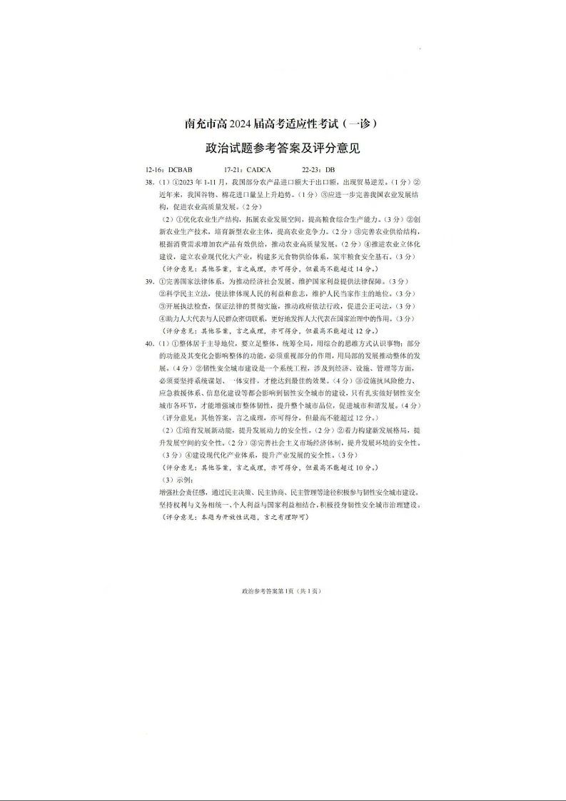 四川省南充市2024届高三上学期一诊考试文综答案