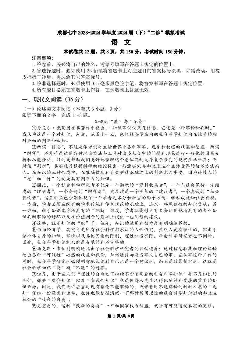 四川省成都市第七中学2024届高三下学期二诊模拟考试语文