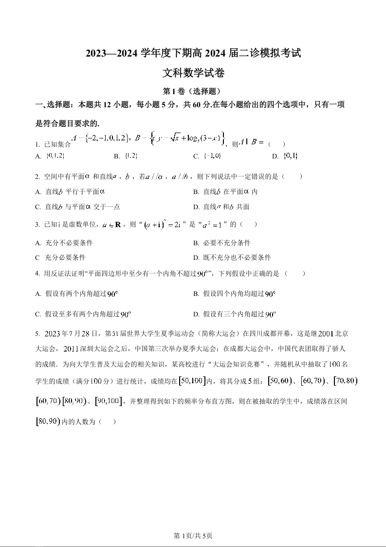 四川省成都市第七中学2024届高三下学期二诊模拟考试文科数学(原卷版)