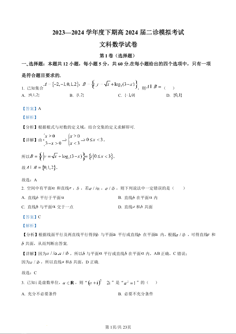 四川省成都市第七中学2024届高三下学期二诊模拟考试文科数学(精品解析版)