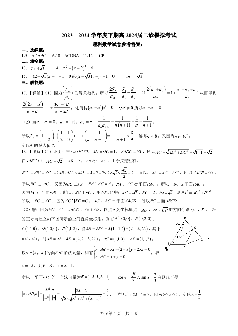 四川省成都市第七中学2024届高三下学期二诊模拟考试理科数学答案