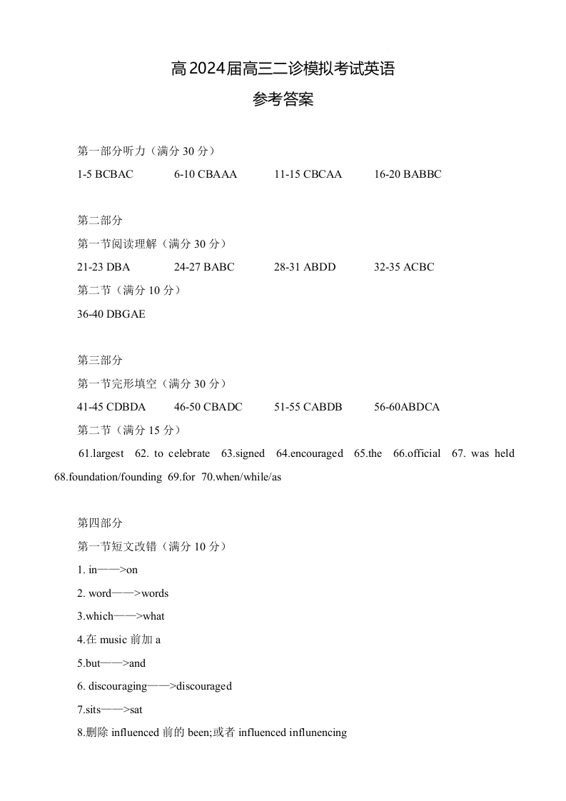 四川省成都市第七中学2024届高三下学期二诊模拟考试英语答案
