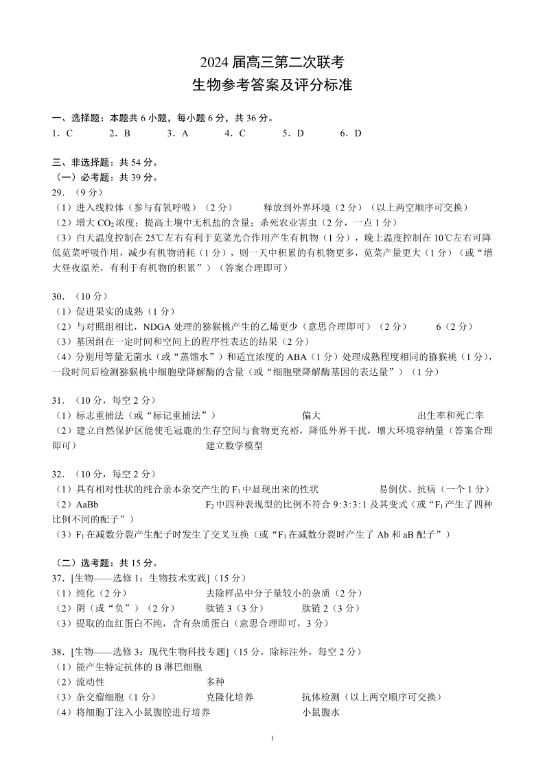 四川省成都市蓉城联盟2024届高三下学期第二次联考生物答案