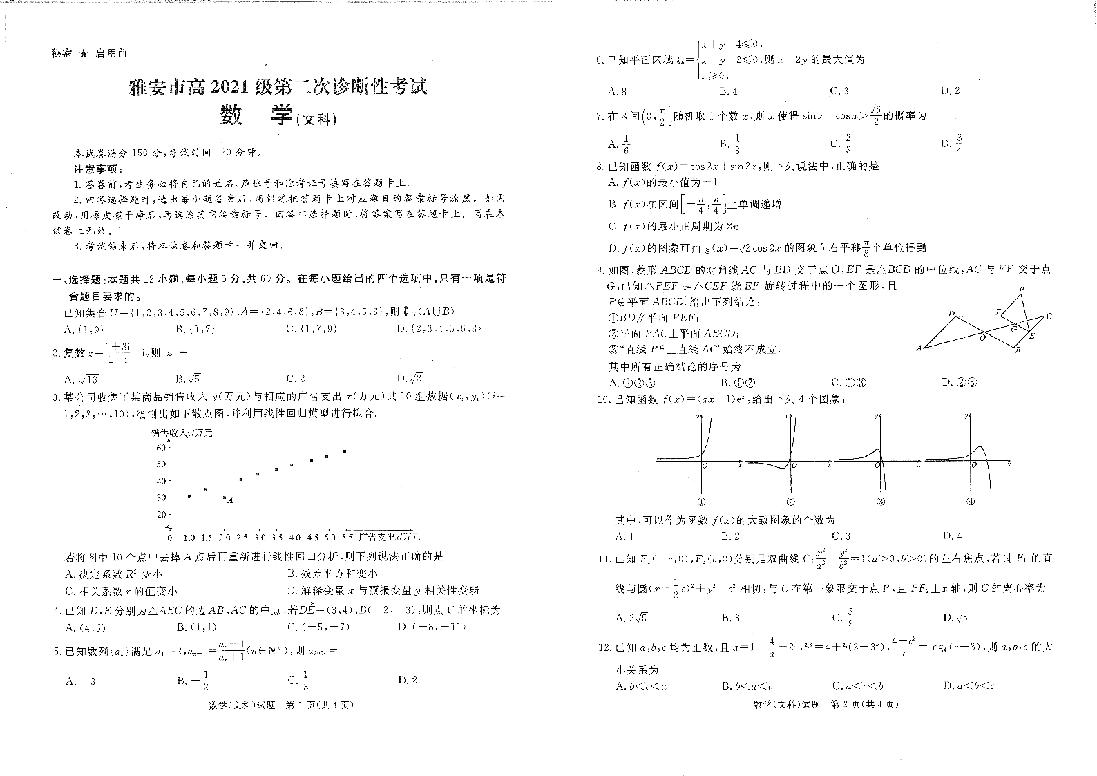 四川省九市(广安、眉山、遂宁、雅安、资阳、乐山、广元、自贡、内江)2024届第二次诊断考试文科数学