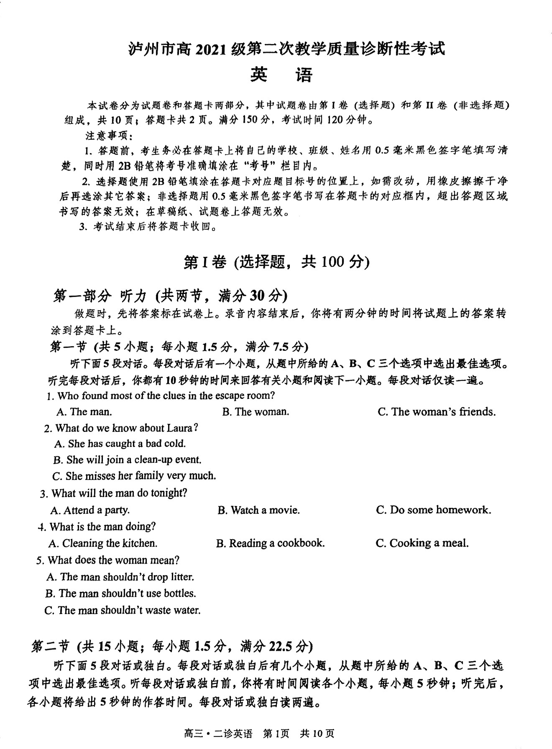四川省泸州市2024届高三第二次教学质量诊断性考试英语