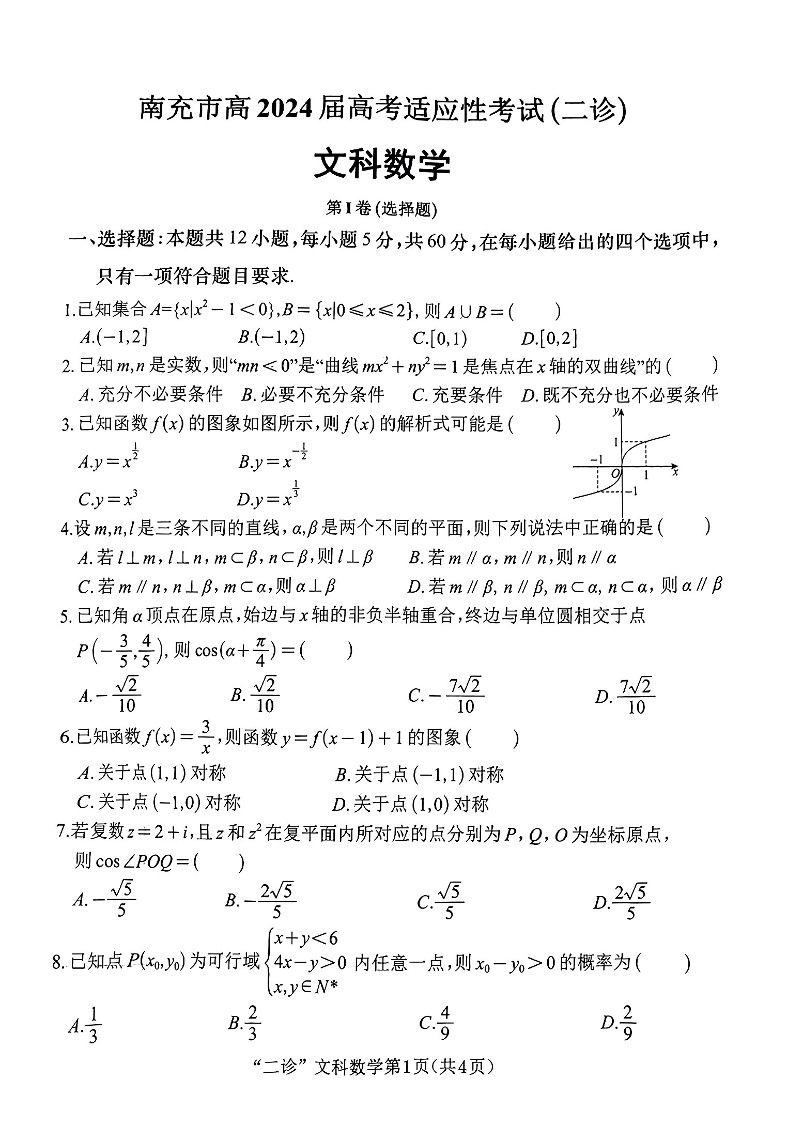 四川省南充市2024届高三高考适应性考试(南充二诊)文科数学