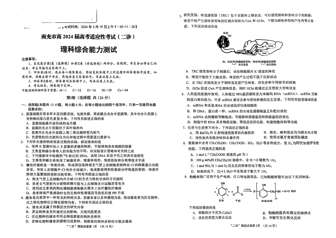 四川省南充市2024届高三高考适应性考试(南充二诊)理综