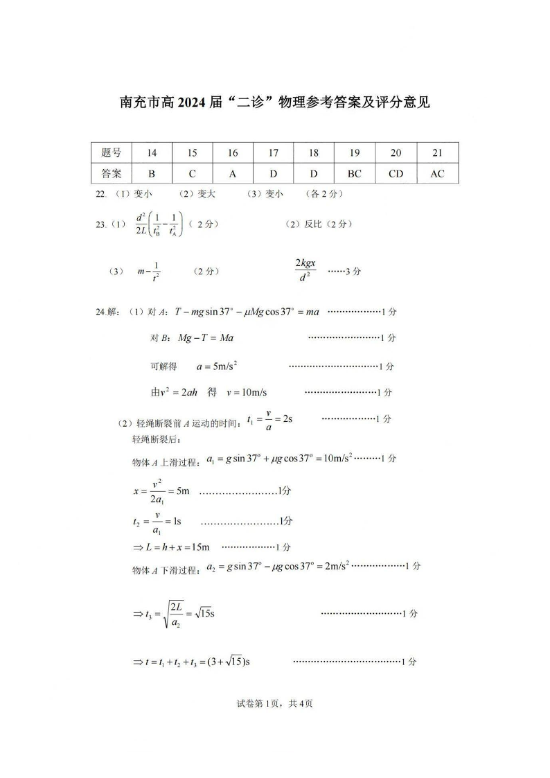 四川省南充市2024届高三高考适应性考试(南充二诊)理综答案