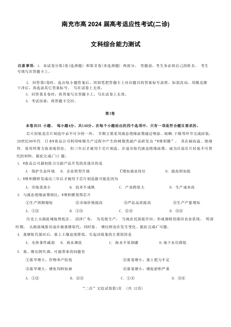四川省南充市2024届高三高考适应性考试(南充二诊)文综