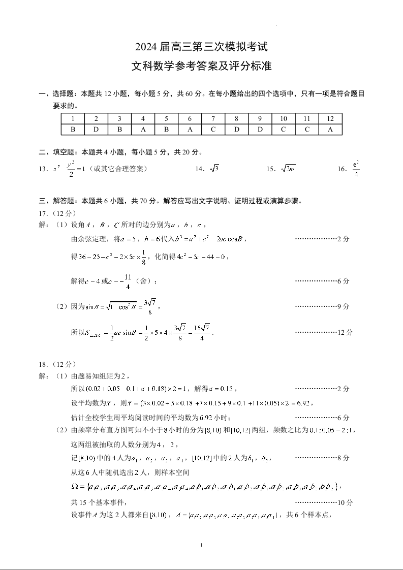四川省成都市蓉城名校联盟2024届高三下学期第三次模拟考试文科数学答案