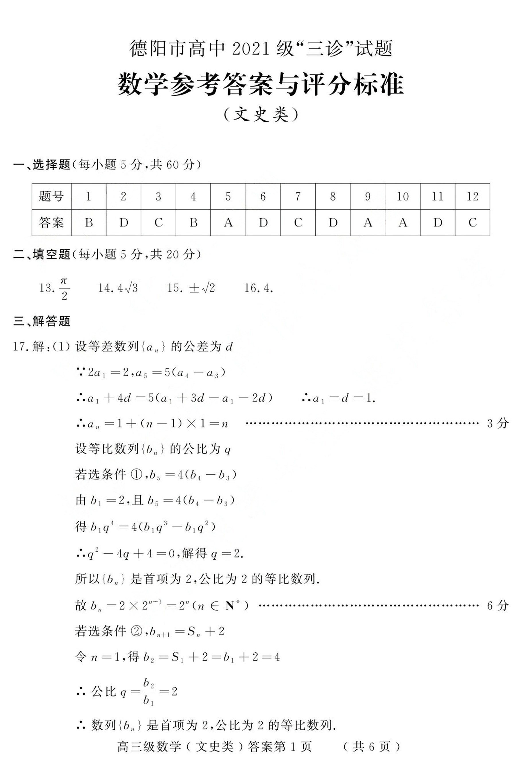 四川省德阳市2024届高三下学期三诊考试文科数学答案