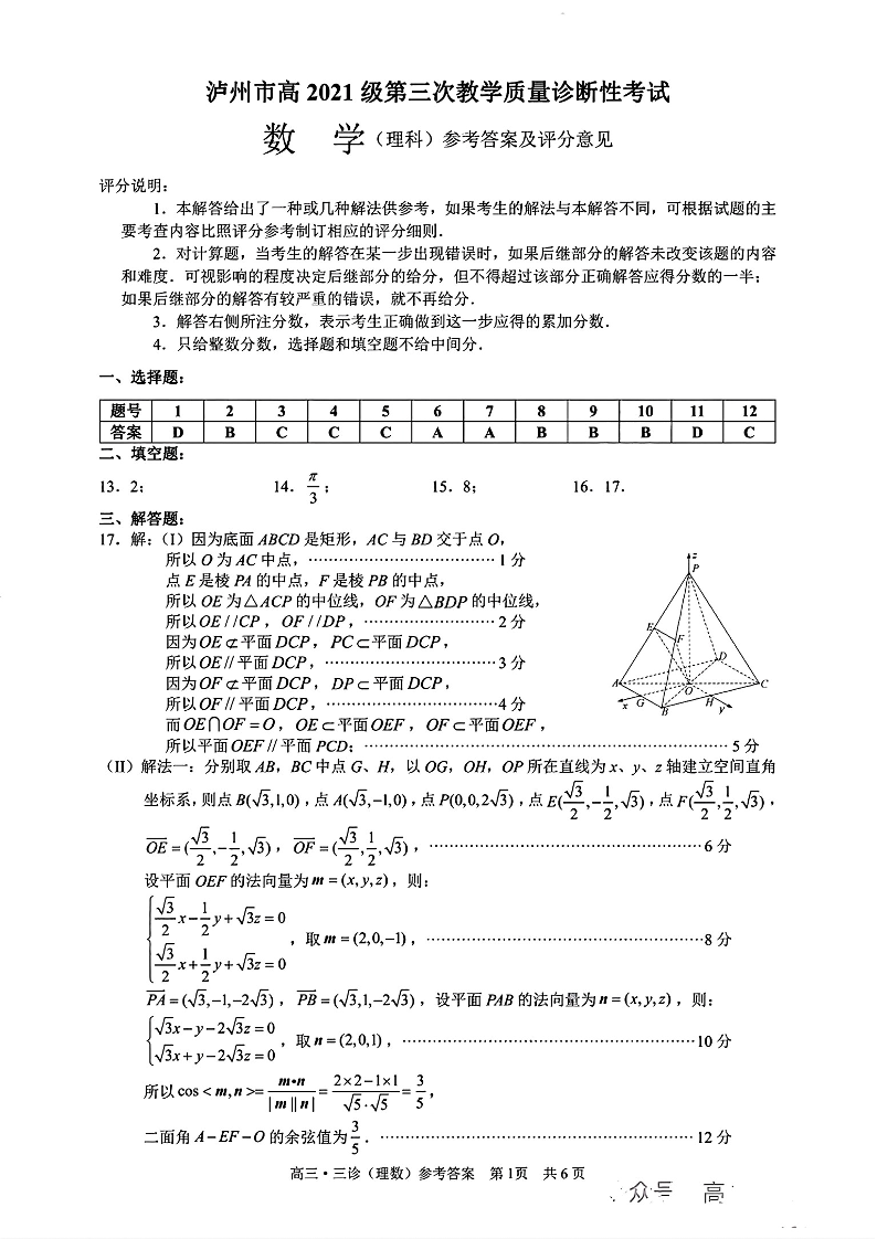 四川省泸州市高2021级第三次教学质量诊断性考试(泸州三诊)理科数学答案