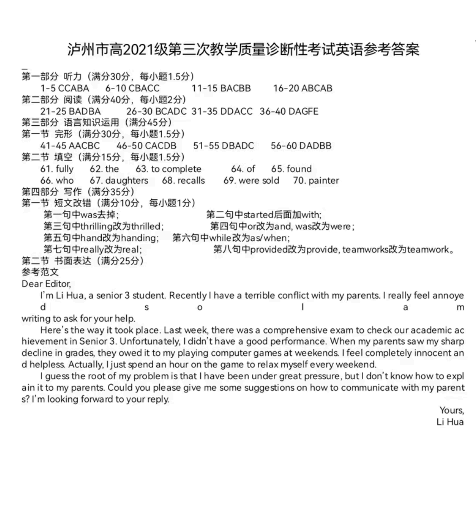 四川省泸州市高2021级第三次教学质量诊断性考试(泸州三诊)英语答案