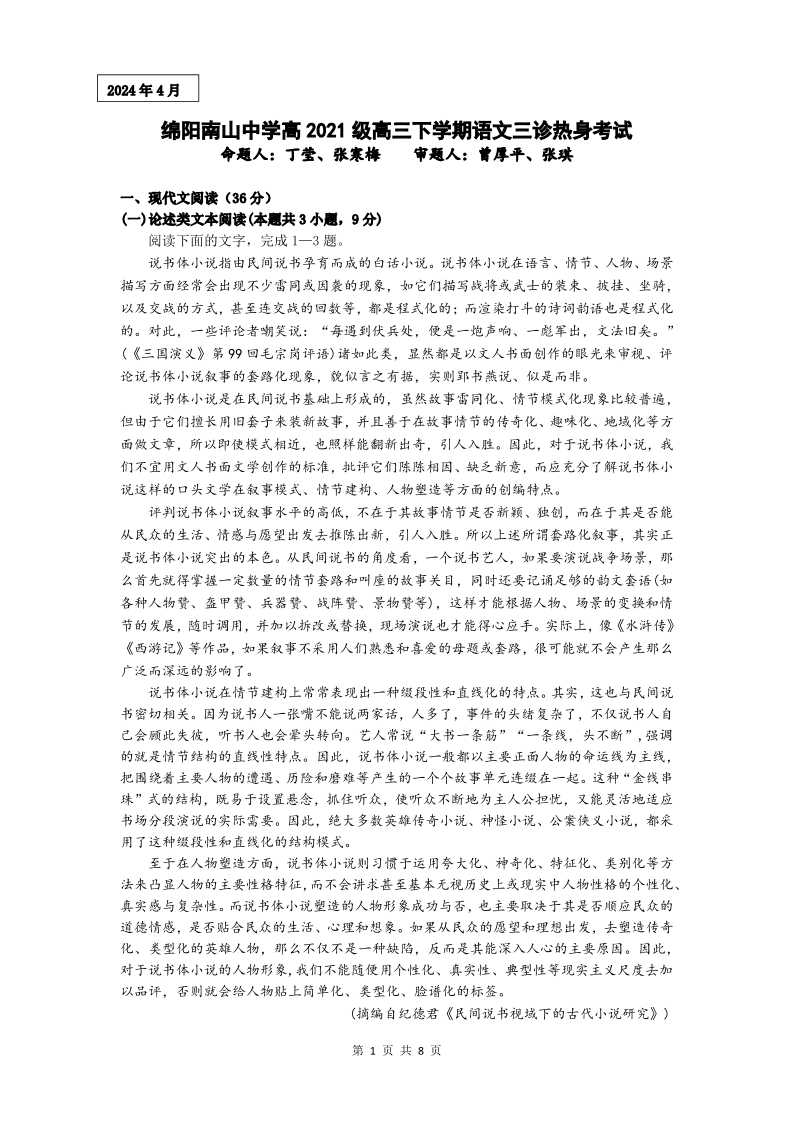 四川省绵阳南山中学2024届高三下学期4月绵阳三诊热身考试语文