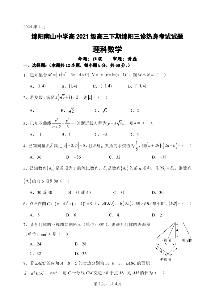 四川省绵阳南山中学2024届高三下学期4月绵阳三诊热身考试理科数学
