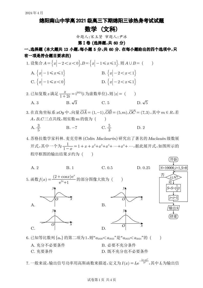 四川省绵阳南山中学2024届高三下学期4月绵阳三诊热身考试文科数学