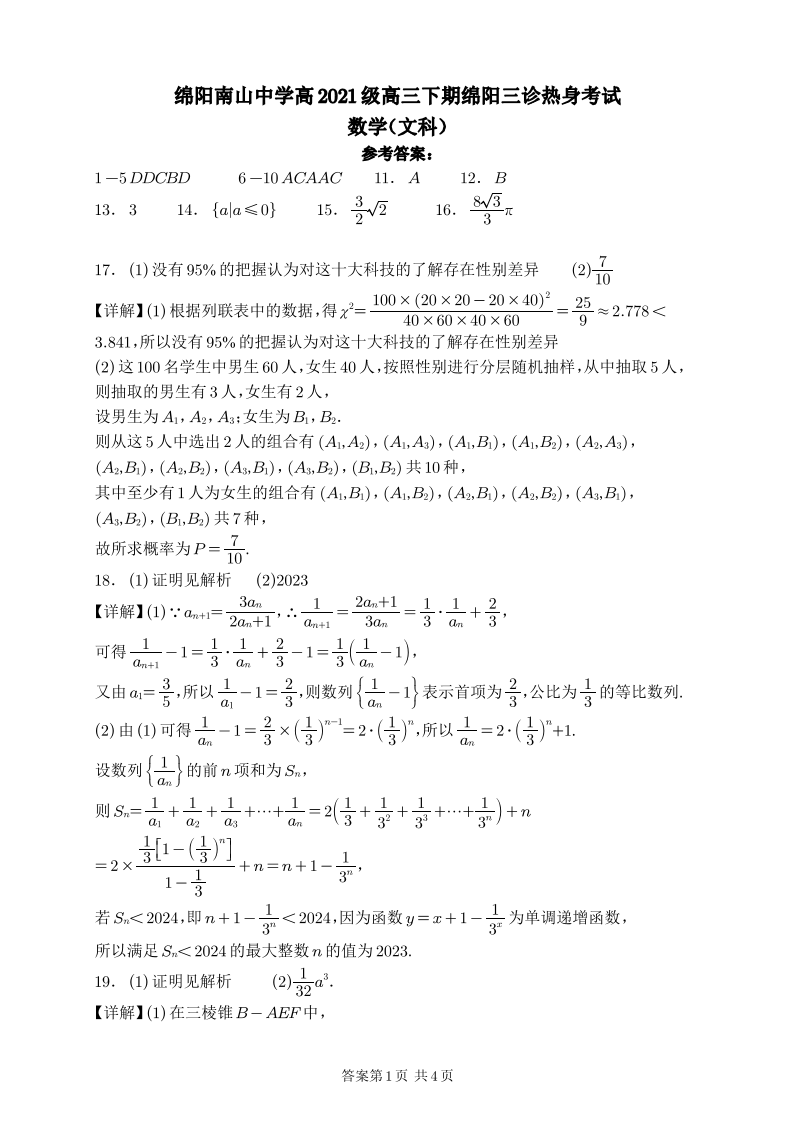 四川省绵阳南山中学2024届高三下学期4月绵阳三诊热身考试文科数学答案