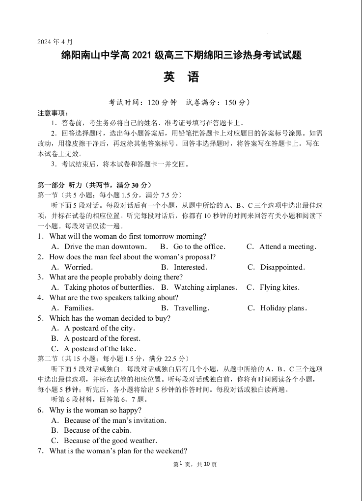 四川省绵阳南山中学2024届高三下学期4月绵阳三诊热身考试英语