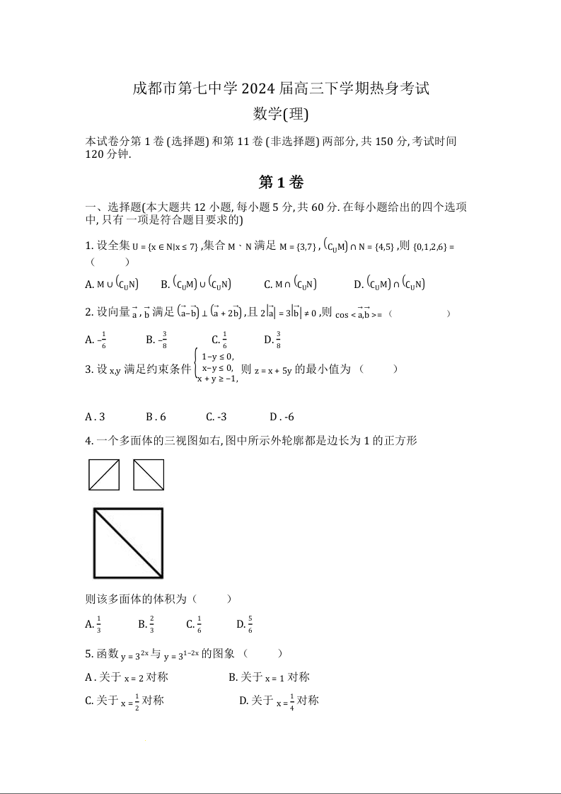四川省成都市第七中学2024届高三下学期热身考试理科数学+答案