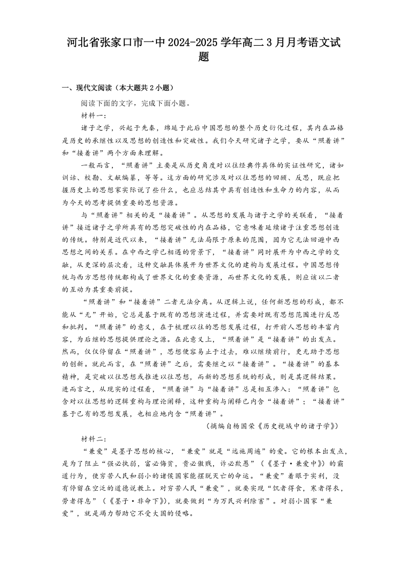 河北省张家口市一中2024-2025学年高二下学期3月月考语文+答案