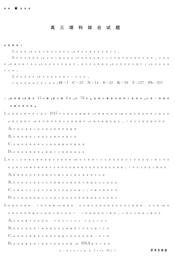 四川省2024届学考大联盟高三年级下学期第三次模拟联考(学考三模)理综