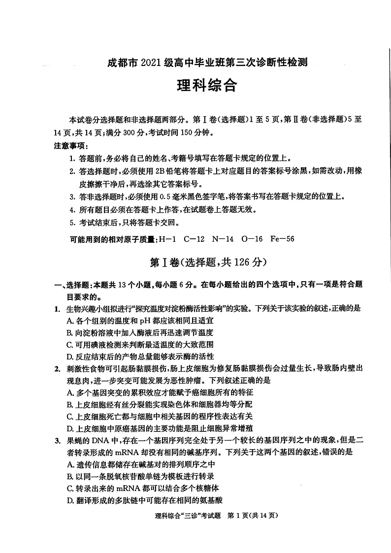 四川省成都市2024届高三下学期第三次诊断性检测(成都三诊)理综