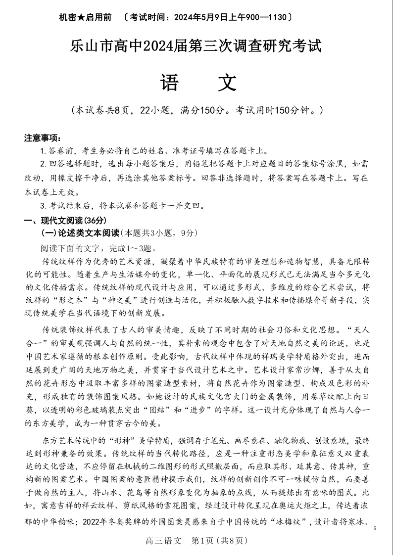 四川省乐山市高中2024届高三年级第三次调查研究考试(乐山三调)语文