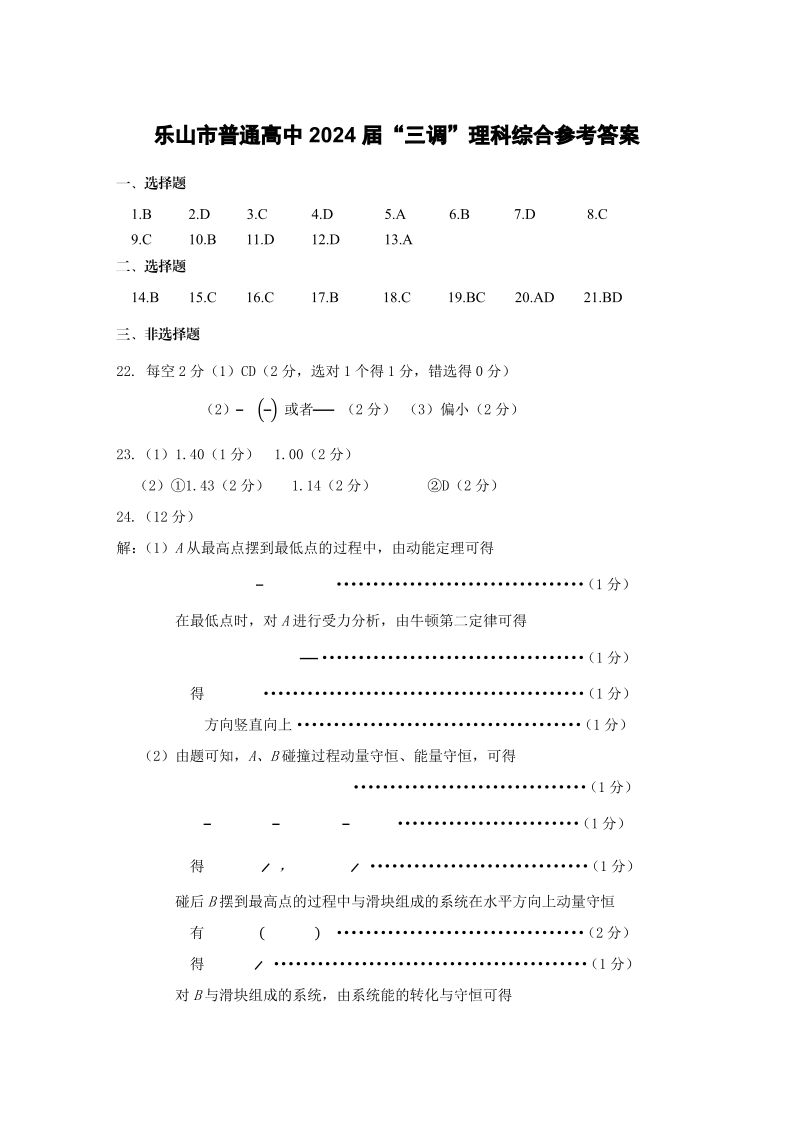 四川省乐山市高中2024届高三年级第三次调查研究考试(乐山三调)理综答案